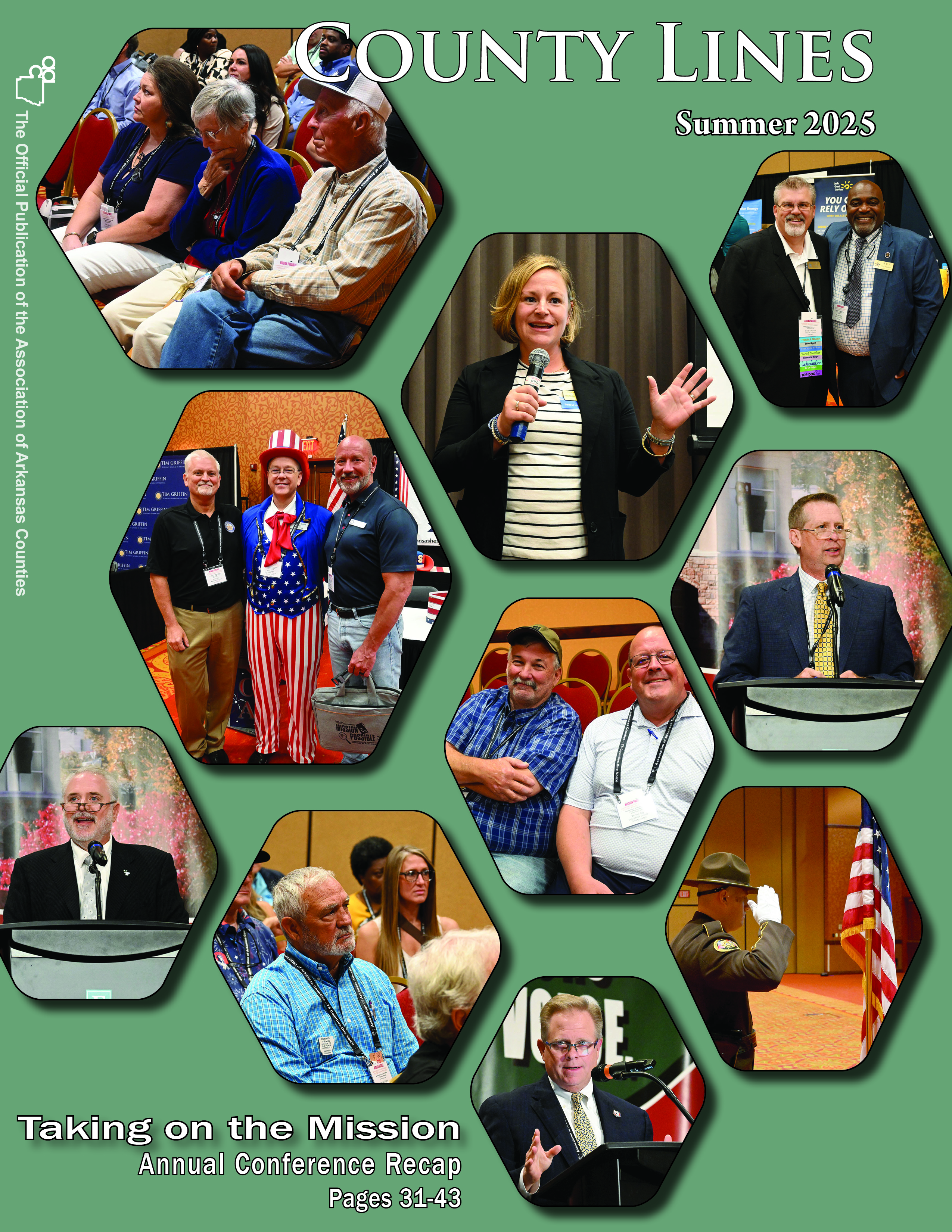 We serve as the official voice for Arkansas counties. The overall purpose of the Association of Arkansas Counties (AAC) is to work for the improvement of county government in the state of Arkansas. Our website includes information about the AAC and about Arkansas counties in general, including contact information for all elected officials. Information also is available about our membership benefits and services for counties. We also have current topics, such as legislative information and AAC's position on matters affecting county government. A calendar of association events also is available online, as well as links to our many publications. Our nine affiliate associations also are accessible through our website. "Helpful Links" provides a short list of links to other websites of interest. You may also contact the AAC staff through our website and learn a little more about who we are. Enjoy your time browsing through Arkansas counties!